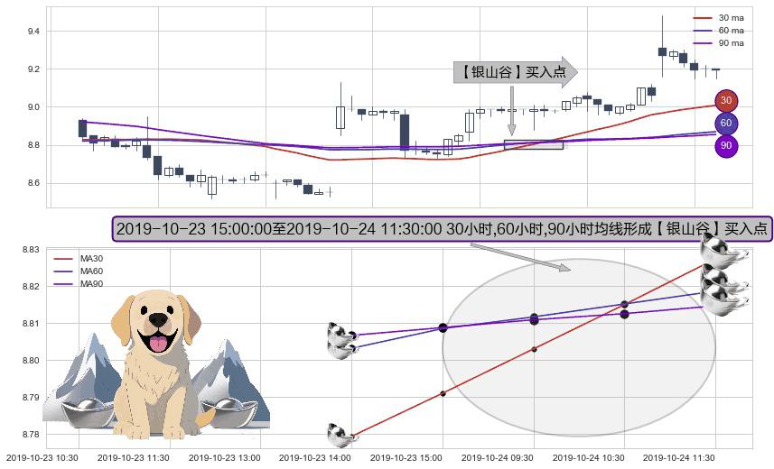 形态多维评估: ⚀ 2019-10-24 09:30:00-小时至2019-10-24 11:30:00-小时显现 30小时-60小时-90小时均线 【银山谷】买入点 看多信号,后市看涨,买入