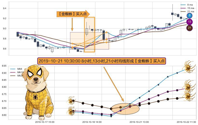 形态多维评估: ⚀ 2019-10-21 10:30:00小时显现 8小时-13小时-21小时均线 【金蜘蛛】买入点 看多信号,后市看涨,买入