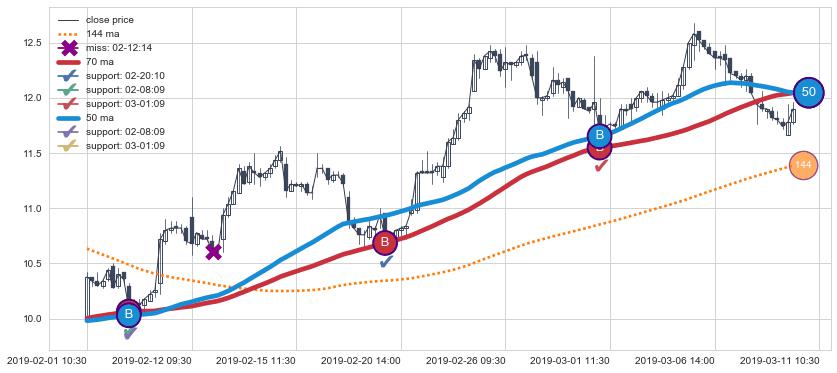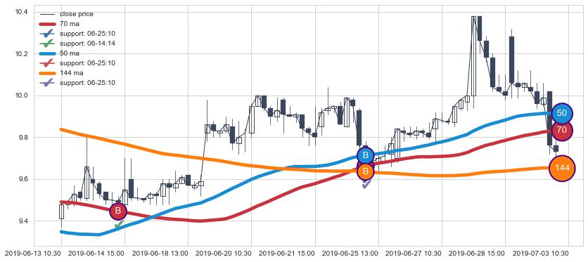 上涨趋势06-13 10:30-07-03 10:30,均线144, 50, 70确认关键支撑2处