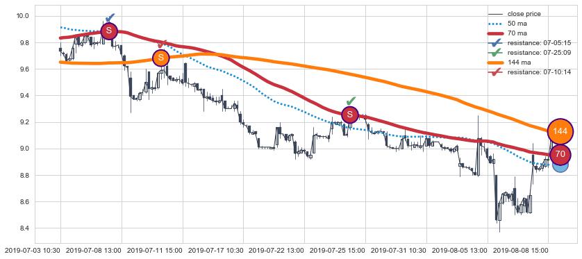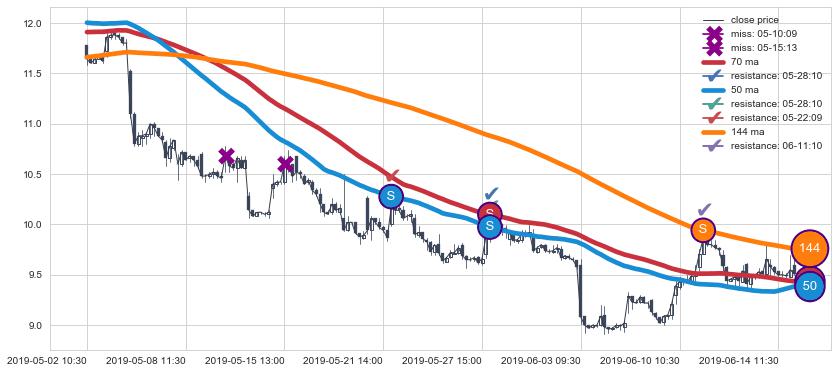 下跌趋势05-02 10:30-06-17 09:30,均线144, 50, 70确认关键阻力3处