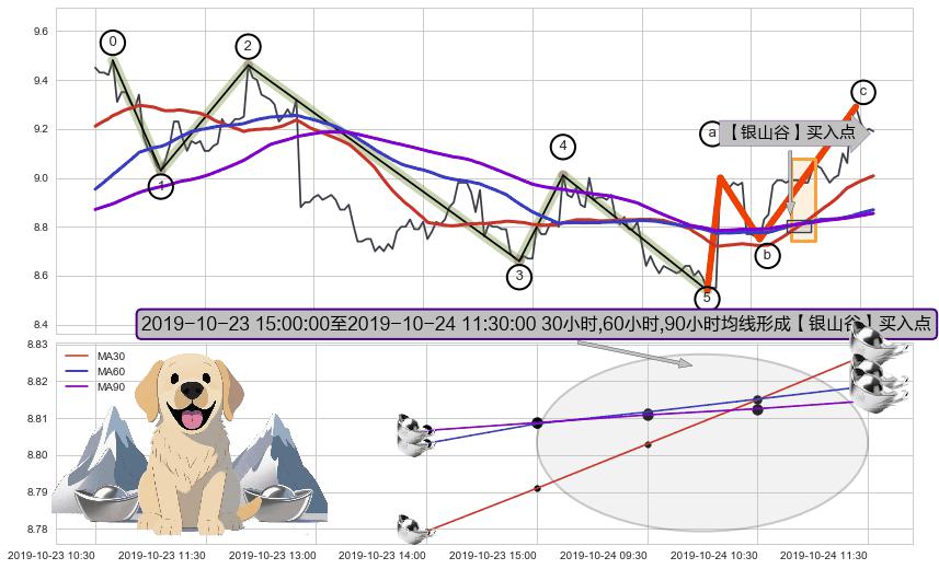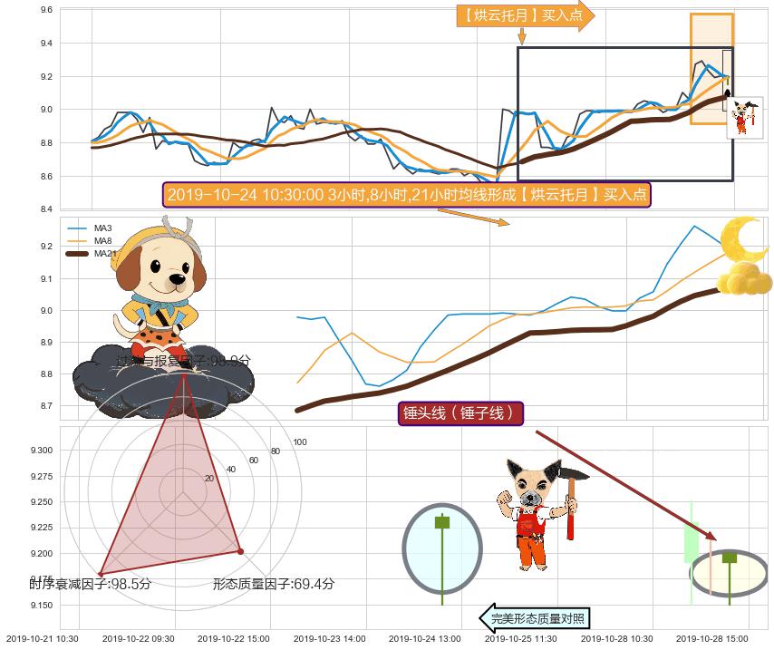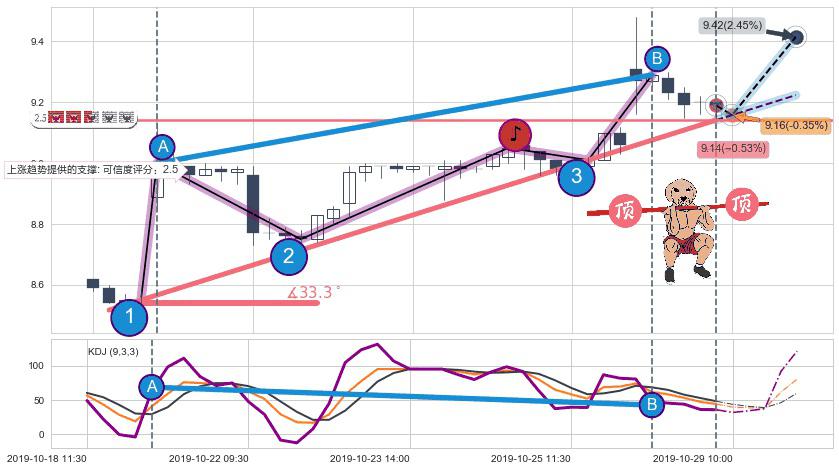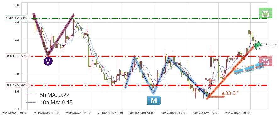 🍖 长线趋势跟踪组合短线均值回复[强支撑信号]2019-10-18 13:00-2019-10-28 15:00上升趋势依然成立(上涨趋势跟踪依然可行),短线价格略微下行回调(均值回复猜想),即将接近趋势提供的未破位的支撑价格:9.14。