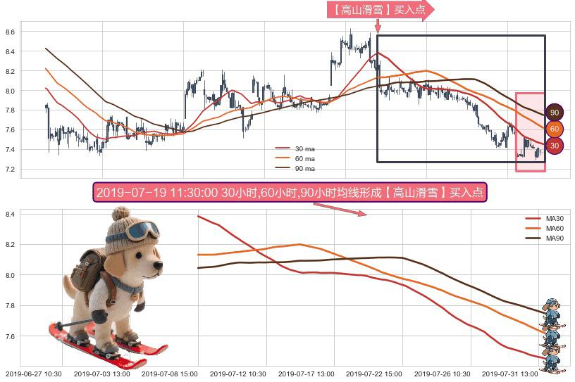 形态多维评估: ⚀ 2019-07-08 15:00:00小时-2019-07-31 15:00:00小时显现 30小时-60小时-90小时均线 【高山滑雪】买入点 看多信号,后市看涨,买入