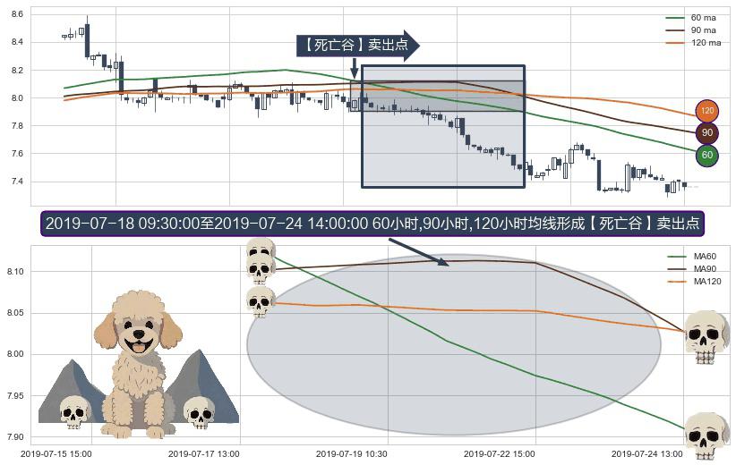 形态多维评估: ⚀ 2019-07-18 10:30:00-小时至2019-07-24 14:00:00-小时显现 60小时-90小时-120小时均线 【死亡谷】卖出点 看空信号,后市看跌,卖出