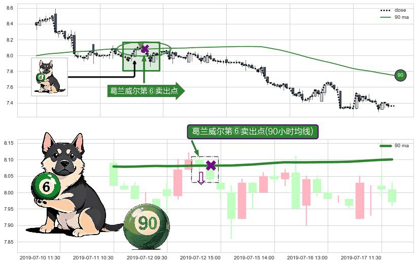 形态多维评估: ⚀ 2019-07-12 13:00:00-小时显现 葛兰威尔均线 90小时均线 第⑥卖出点 走势反转见顶信号,后市看跌,卖出信号