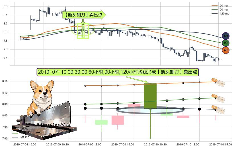 形态多维评估: ⚀ 2019-07-10 09:30:00小时显现 60小时-90小时-120小时均线 【断头铡刀】卖出点 看空信号,后市看跌,卖出