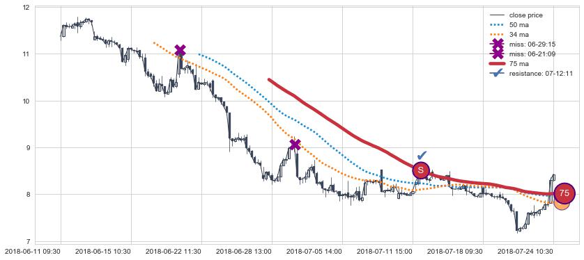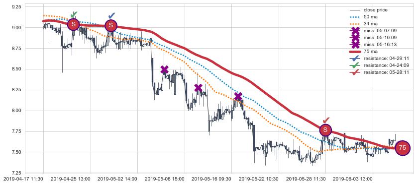 下跌趋势04-17 11:30-06-05 13:00,均线75确认关键阻力3处