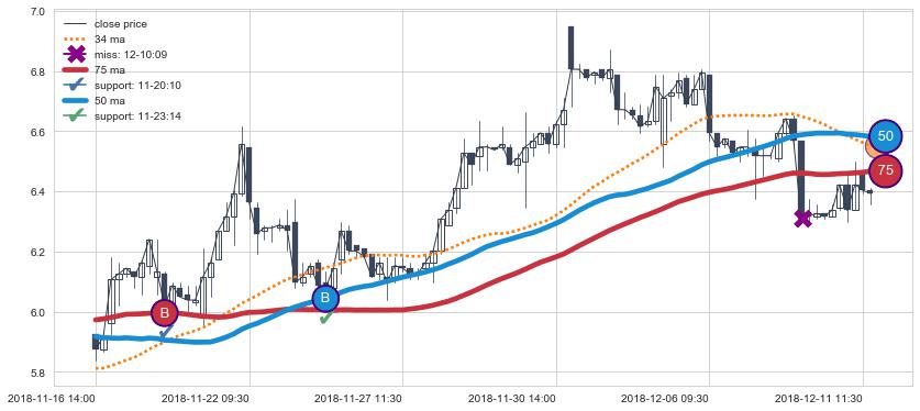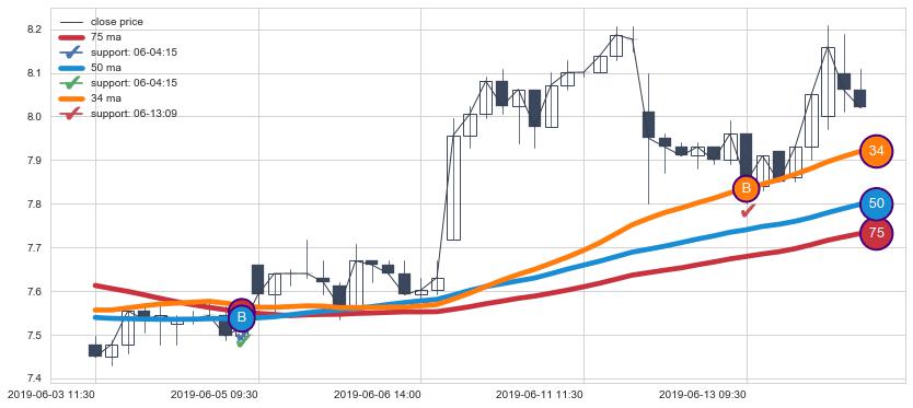 上涨趋势06-03 11:30-06-14 10:30,均线50, 75, 34确认关键支撑2处