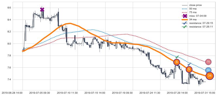 下跌趋势06-28 14:00-07-31 15:00,均线34确认关键阻力2处