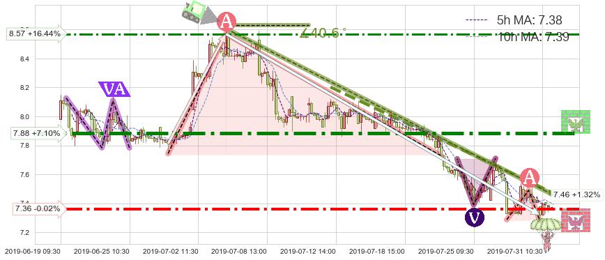 🦴 长线均值回复组合短线趋势跟踪[强阻力信号]2019-07-04 09:30-2019-07-31 14:00下跌趋势依然成立(下跌趋势跟踪依然存在),短线价格略微上行反弹(均值回复猜想),即将接近下跌趋势提供的未破位阻力价格:7.46。