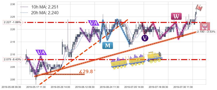 ♘ 在最后的上升阶段2019-05-10 14:00至2019-07-31 15:00存在 持续未破位的支撑位 ,支撑价格2.190,支撑可信任强度86.42%,其距离最后价格2.270相差 -3.53%
