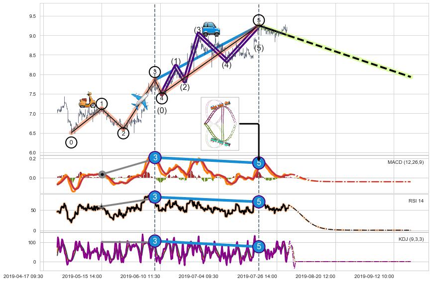 ➢ 1,3,5驱动浪MACD, RSI, KDJ走势都出现【常规背离】反转信号增强