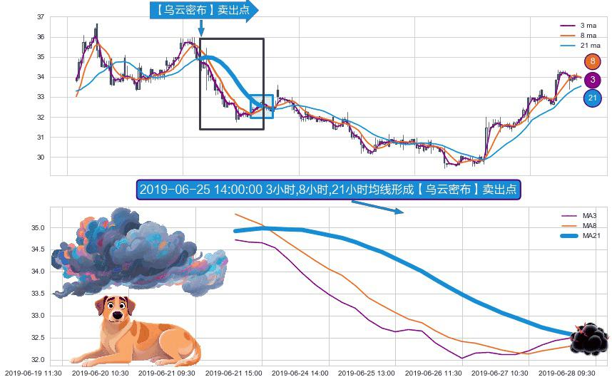 ⚀ 2019-06-21 13:00:00小时-2019-06-27 15:00:00小时显现 3小时-8小时-21小时均线 【乌云密布】卖出点 看空信号,后市看跌,卖出