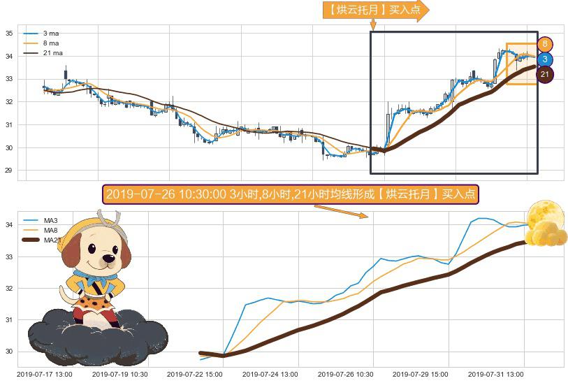⚀ 2019-07-22 11:30:00小时-2019-07-31 15:00:00小时显现 3小时-8小时-21小时均线 【烘云托月】买入点 看多信号,后市看涨,买入