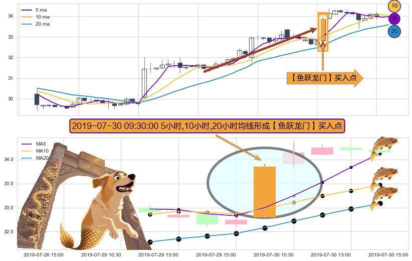 ⚀ 2019-07-30 09:30:00小时显现 5小时-10小时-20小时均线 【鱼跃龙门】买入点 看多信号,后市看涨,买入