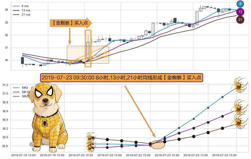 ⚀ 2019-07-23 09:30:00小时显现 8小时-13小时-21小时均线 【金蜘蛛】买入点 看多信号,后市看涨,买入