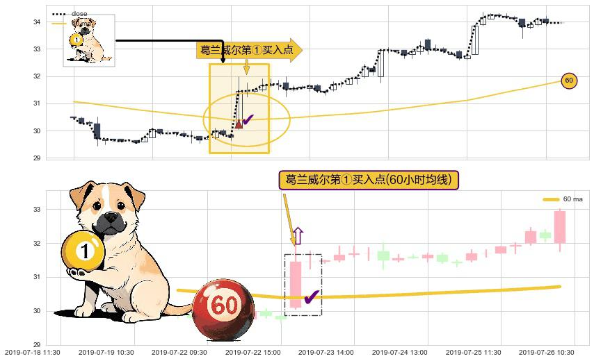 ⚀ 2019-07-23 09:30:00-小时显现 葛兰威尔均线 60小时均线 第买①入点 走势反转见底信号,后市看涨,买进信号