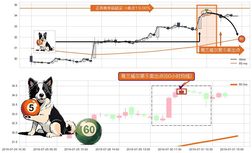 ⚀ 2019-07-30 11:30:00-小时显现 葛兰威尔均线 60小时均线 第⑤卖出点 上升趋势均值回复的短线回落信号,后市看跌,卖出信号