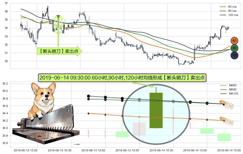 ⚀ 2019-06-14 09:30:00小时显现 60小时-90小时-120小时均线 【断头铡刀】卖出点 看空信号,后市看跌,卖出