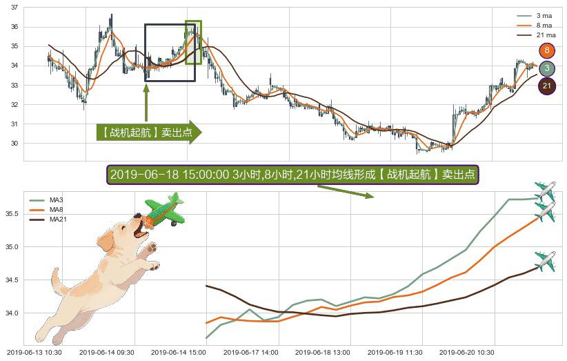 ⚀ 2019-06-14 15:00:00小时-2019-06-20 14:00:00小时显现 3小时-8小时-21小时均线 【战机起航】卖出点 看空信号,后市看跌,卖出