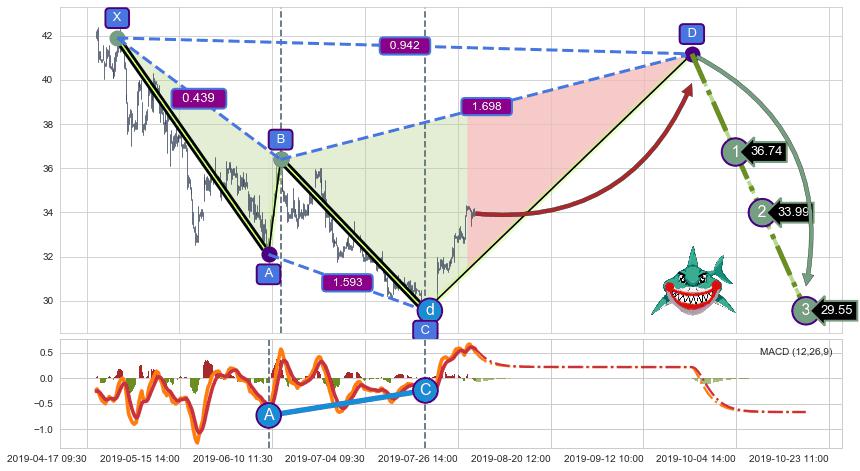 ➢ 距离预测D点位置尚有上涨空间,短线依然【看涨】, 耐心等待看跌【鲨鱼】形态反转启动
