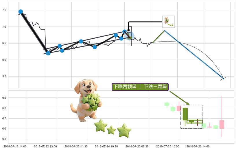 从2019-07-03 09:30至2019-07-09 11:30,共包含27个小时,阶段股价下跌-17.83%,阶段股价变动位移路程比: 1 : 1.2,2019-07-09 09:30向↘︎形成缺口,跳空下跌-9.12%˚