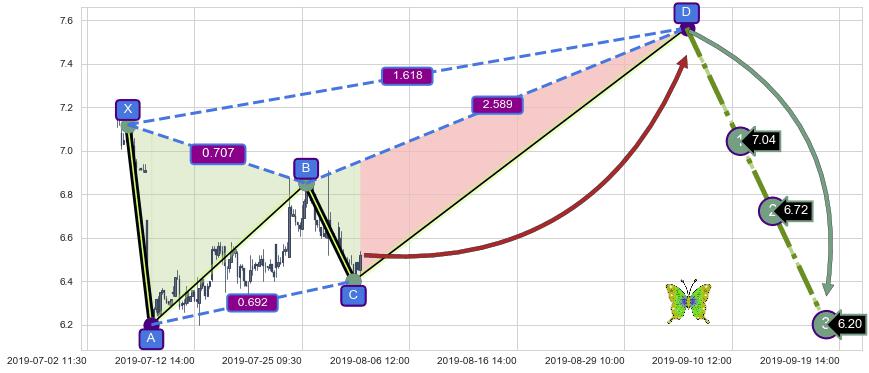 ➣ 未完成【蝴蝶】形态起点X: 07-05:13, 已到达C点: 07-31:09, 预测最终D点: 09-04:15, 共259交易小时