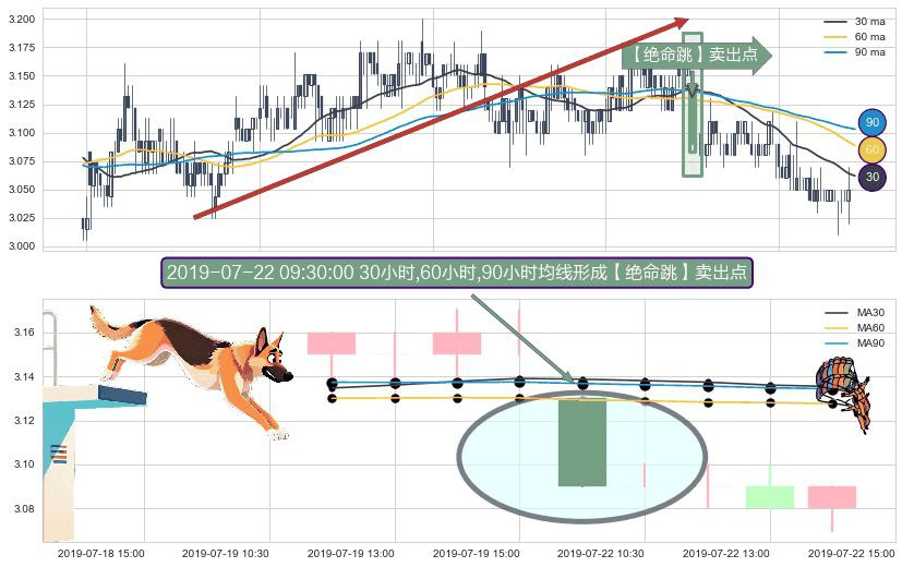 形态多维评估: ⚀ 2019-07-22 09:30:00小时显现 30小时-60小时-90小时均线 【绝命跳】卖出点 看空信号,后市看跌,卖出