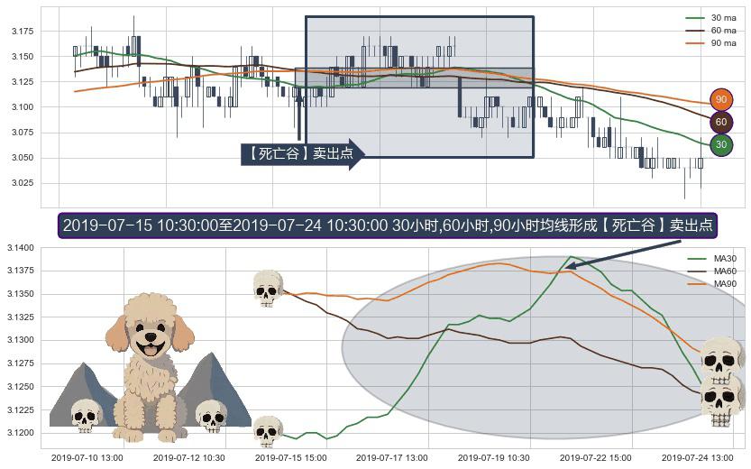 形态多维评估: ⚀ 2019-07-15 11:30:00-小时至2019-07-24 10:30:00-小时显现 30小时-60小时-90小时均线 【死亡谷】卖出点 看空信号,后市看跌,卖出
