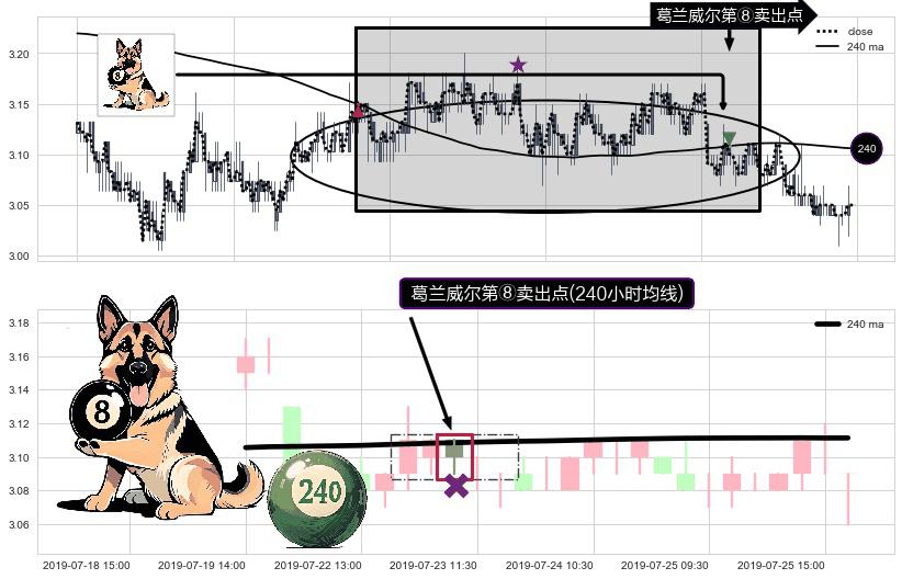 形态多维评估: ⚀ 2019-07-23 10:30:00-小时显现 葛兰威尔均线 240小时均线 第⑧卖出点 下降趋势的中继信号,后市看跌,卖出信号