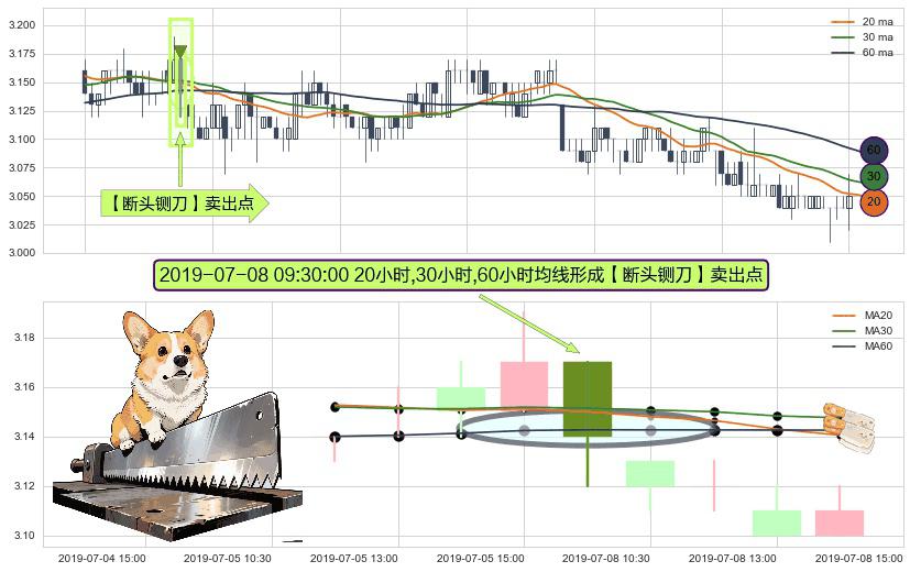 形态多维评估: ⚀ 2019-07-08 09:30:00小时显现 20小时-30小时-60小时均线 【断头铡刀】卖出点 看空信号,后市看跌,卖出