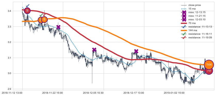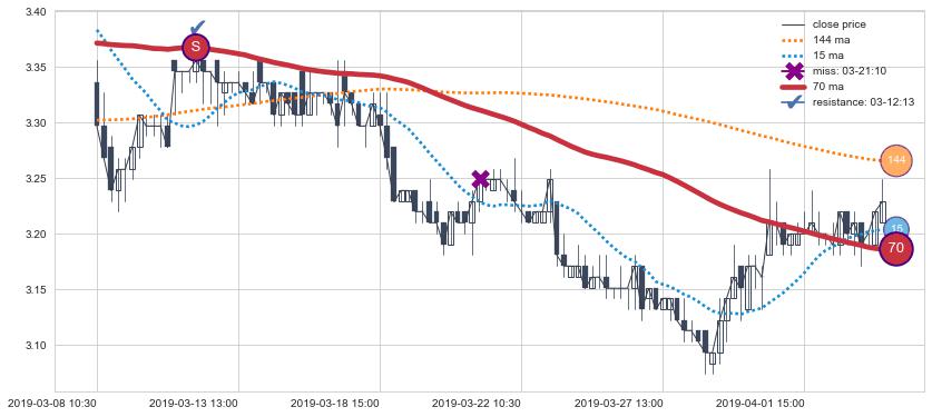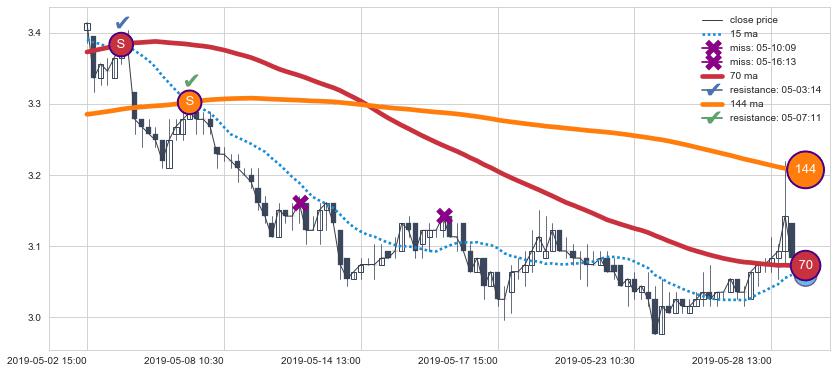 下跌趋势05-02 15:00-05-29 09:30,均线144, 70确认关键阻力2处