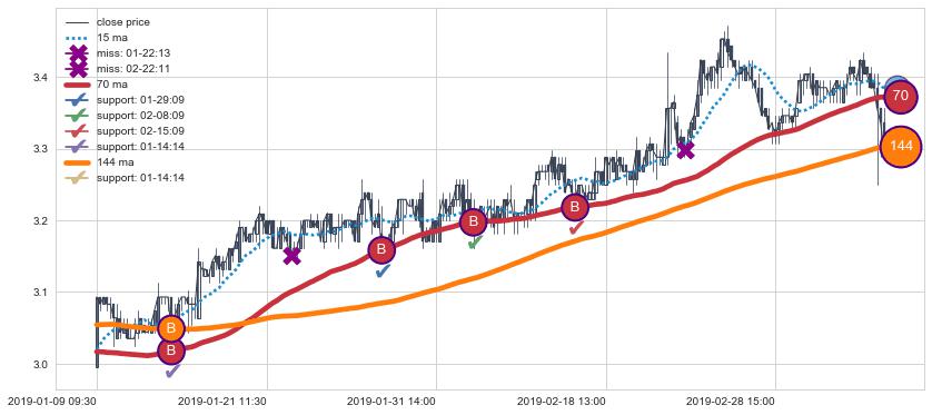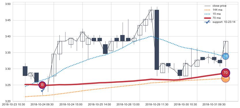 上涨趋势01-09 09:30-03-08 10:30,均线144, 70确认关键支撑4处