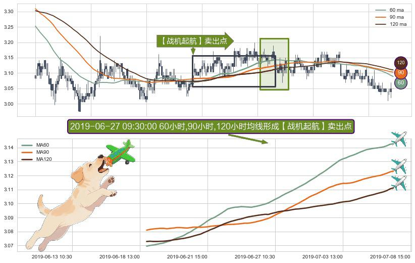 形态多维评估: ⚀ 2019-06-18 15:00:00小时-2019-07-08 09:30:00小时显现 60小时-90小时-120小时均线 【战机起航】卖出点 看空信号,后市看跌,卖出