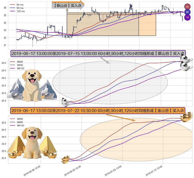 ⚂ 金山谷 高于 银山谷,表明 均线逆转 反弹势头明确,是更强的见底信号更可靠的买入信号