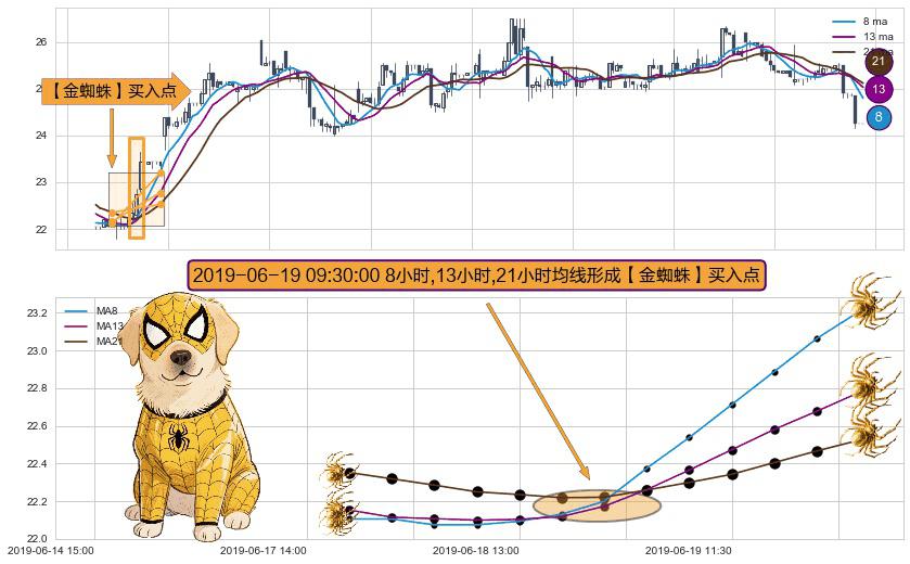 ⚀ 2019-06-19 09:30:00小时显现 8小时-13小时-21小时均线 【金蜘蛛】买入点 看多信号,后市看涨,买入