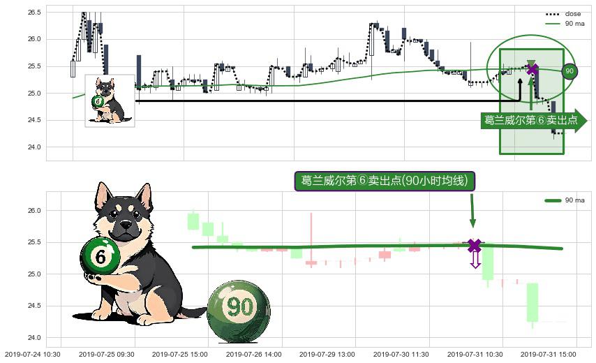 ⚀ 2019-07-30 15:00:00-小时显现 葛兰威尔均线 90小时均线 第⑥卖出点 走势反转见顶信号,后市看跌,卖出信号