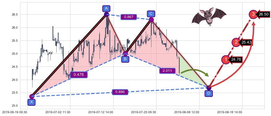 ➢ 接近预测D点位置, 随时警戒看涨【蝙蝠】形态反转启动