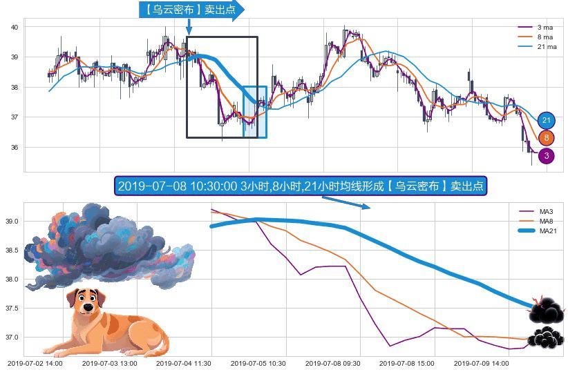 ⚀ 2019-07-04 11:30:00小时-2019-07-10 09:30:00小时显现 3小时-8小时-21小时均线 【乌云密布】卖出点 看空信号,后市看跌,卖出