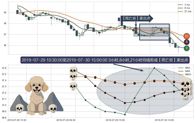 ⚀ 2019-07-29 11:30:00-小时至2019-07-30 15:00:00-小时显现 3小时-8小时-21小时均线 【死亡谷】卖出点 看空信号,后市看跌,卖出