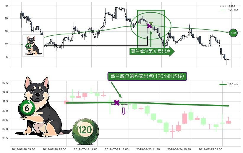 ⚀ 2019-07-22 11:30:00-小时显现 葛兰威尔均线 120小时均线 第⑥卖出点 走势反转见顶信号,后市看跌,卖出信号