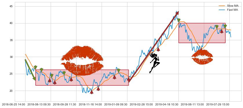 ⚅ 卖点向下突破均线后,价格走势很纠结,不断在均线周围试探,有再次上探突破均线的可能