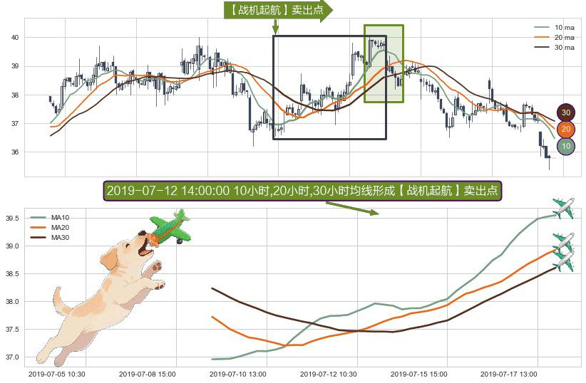 ⚀ 2019-07-09 13:00:00小时-2019-07-17 15:00:00小时显现 10小时-20小时-30小时均线 【战机起航】卖出点 看空信号,后市看跌,卖出