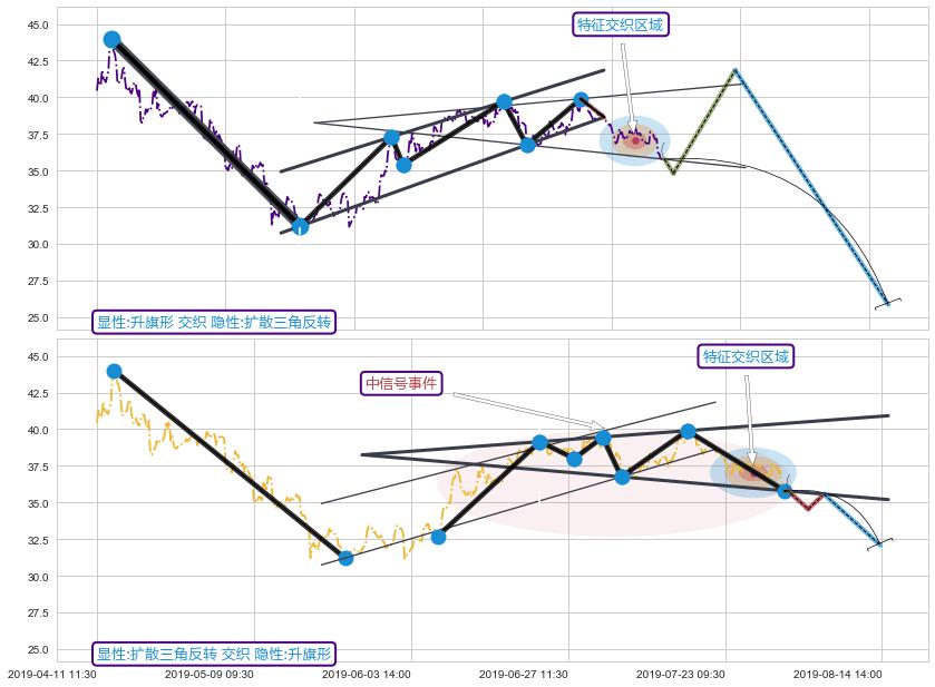 | 5 📐:扩散三角反转临近支撑猜想转换阻力下跌 ➕ 🌊:波浪理论c点反弹终止反转下跌 ☞ 看空信号 ⇥ 【图形】交织【图形】⇥ 综合量化分数: 40 | > |
