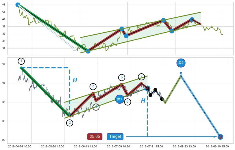 ➢ 最小反转跌幅→𝐇: 12.74 (逐步抬高阻力斜边最后的阻力点⑥与支撑边垂直距离)