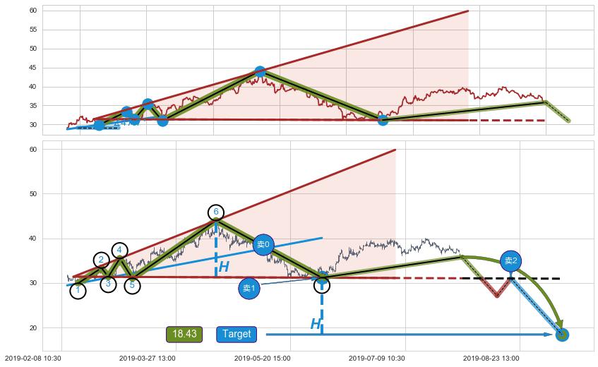 从2019-02-21 14:00至2019-03-20 14:00,共包含115个小时,阶段股价上涨19.73%,阶段股价变动位移路程比: 1 : 5