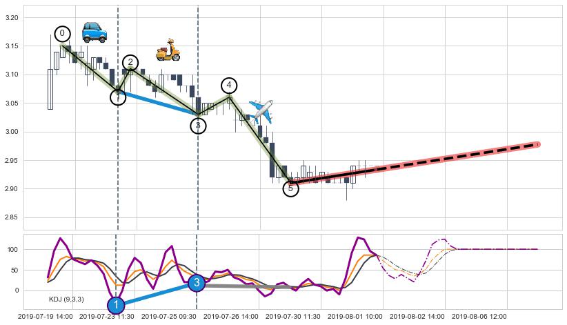 ➣ 第一, 三驱动浪端点:【KDJ】走势出现【常规背离 & 反转信号】背离程度99.00%,背离夹角角度84.5˚,背离程度较大