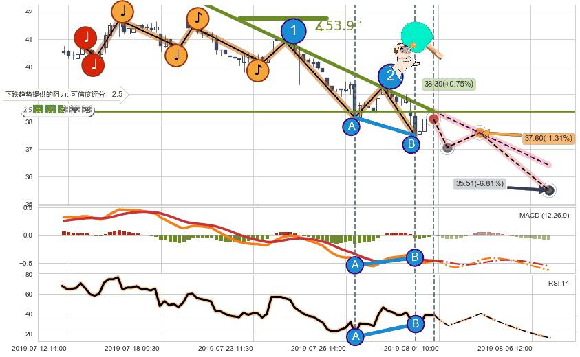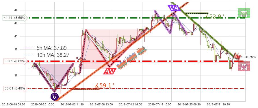 ➣ 预测:2019-08-02 13:00,【试探阻力】稳定目前下跌趋势的前提下,预测价格:37.60