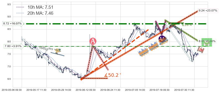♘ 阻力价格位7.80,可信任强度41.85%,距离最后交易2019-07-31 15:00形成的收盘价格7.51相差 +3.91%