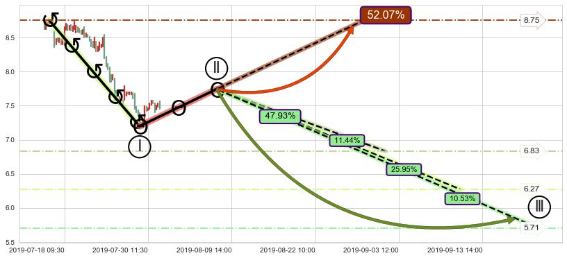 从2019-07-16 13:00至2019-07-31 14:00,共包含68个小时,阶段股价下跌-14.88%,阶段股价变动位移路程比: 1 : 3,下跌趋势角度: 28.4