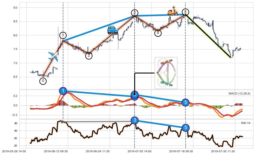 从2019-05-27 14:00至2019-06-18 10:30,共包含88个小时,阶段股价上涨5.87%,阶段股价变动位移路程比: 1 : 9